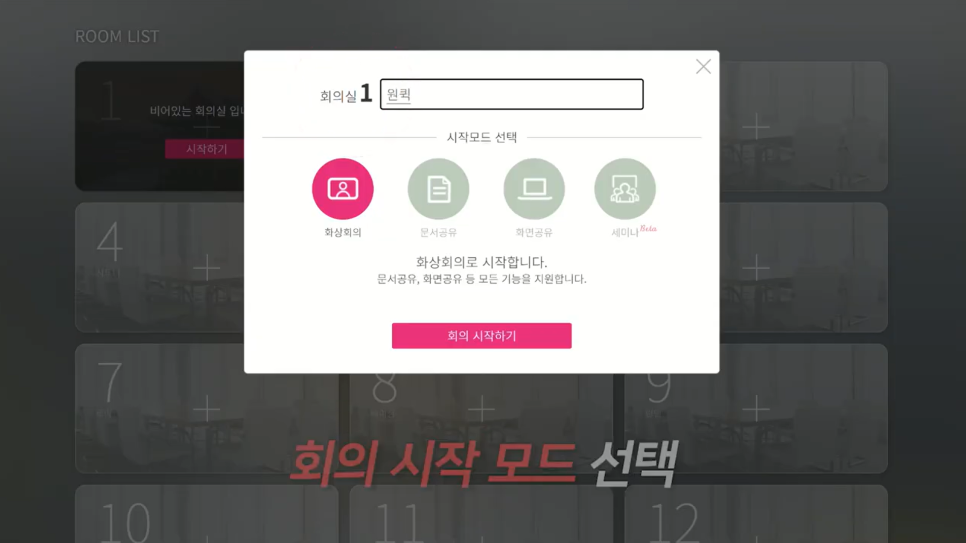 회의 제목을 입력, 회의 시작 모드를 고르고