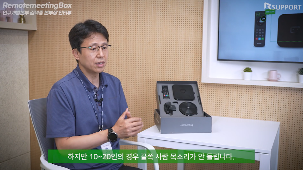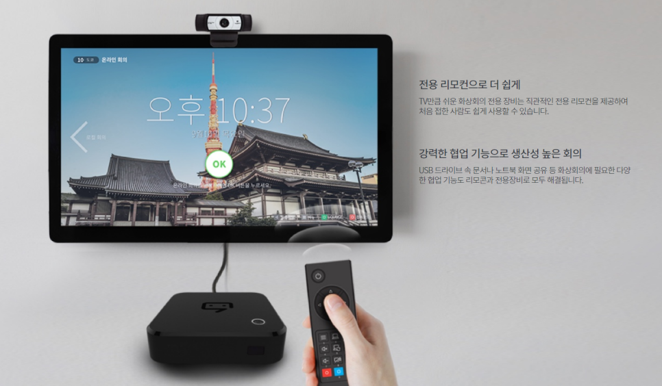 리모컨 버튼 하나로 쉽게 쓸 수 있는 화상회의실, 리모트미팅 박스로 완성해 보세요.