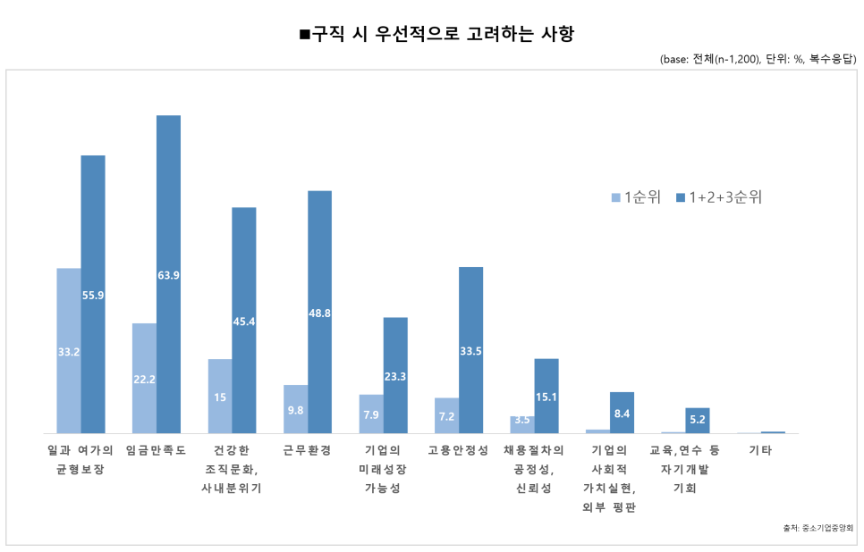 중소기업중앙회에서 작년 청년 구직자 1,200명을 대상으로 조사한 청년일자리 인식조사에서 가장 고려하는 1순위로 '일과 여가의 균형 보장'(33.2%), 즉 워라벨이 중요하다고 답했으며 다음은 '임금 만족도'(22.2%), '건강한 조직문화, 사내분위기'(15%) 순으로 나왔는데요. MZ 세대들은 개인 여가 시간 확보, 건강한 대인관계를 중시하는 모습을 엿볼 수 있습니다.