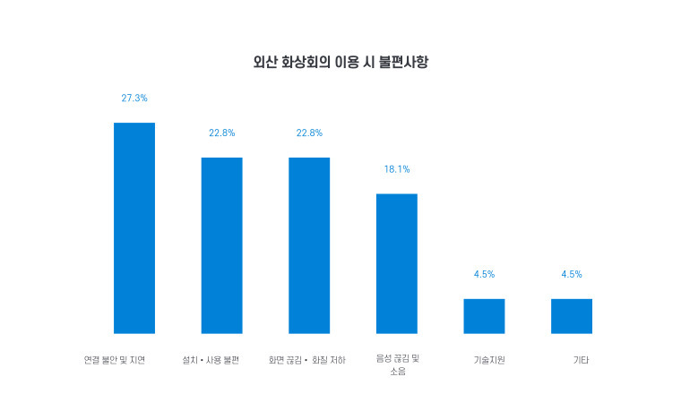 서비스를 이용하는 공무원의 99.5%는 외산 화상회의에 대한 불만족을 나타냈다. 특히 화면이나 음성 끊김 등 성능 불만족이 68.2%로 가장 높은 비중을 차지했고 프로그램 설치 또는 사용이 불편하다는 응답도 22.8%에 이르렀다.