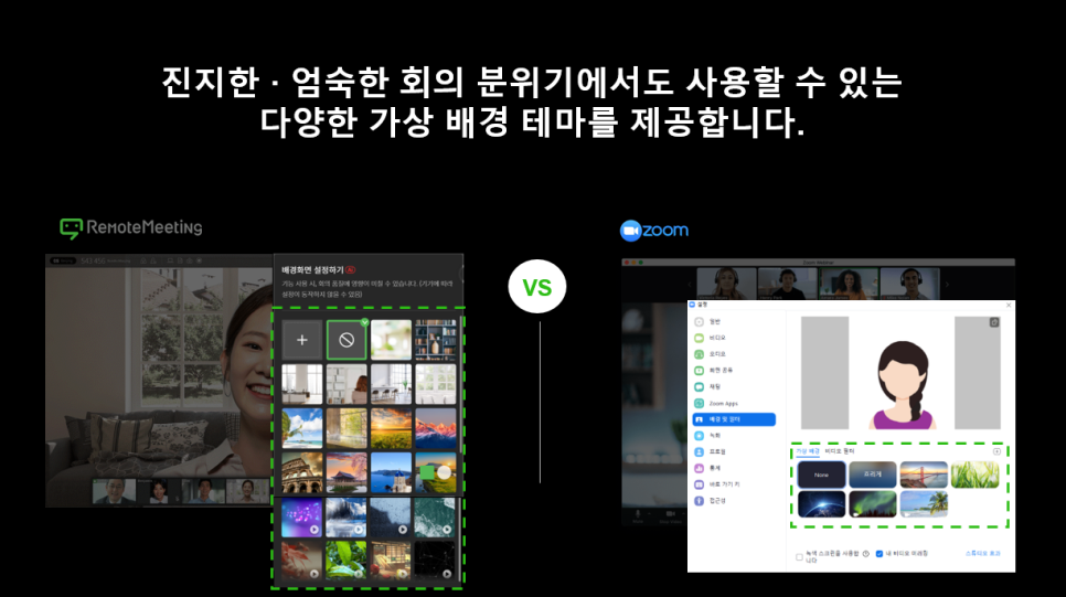 재택근무 중 화상회의를 진행하실 때, 내 방의 적나라한 모습 그대로를 직장 동료들에게 보여주기 꺼려하시는 분들이 많은데요. 이럴 때, 유용하게 사용되는 기능이 바로 '가상 배경'입니다. 줌(ZOOM)도 현재 가상 배경을 제공하고 있지만, 웹 브라우저에서 내 배경을 흐리게 블러 처리하거나, 내 배경을 가상 이미지 또는 동영상으로 처리할 수 있는 제품은 리모트미팅이 유일합니다. 가상 배경 적용을 위해 무거운 프로그램을 다운로드 받을 필요 없이 화상회의 진행 도중에 내가 원하는 배경을 웹에서 바로 적용할 수 있습니다.