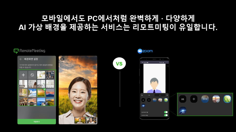 가상 배경을 적용했다고 해서 인물과 배경이 너무 동떨어져 보이면 안되겠죠? 줌(ZOOM)의 경우에는 일반 화상회의를 진행할 경우 720p의 해상도를 제공하다가 가상 배경을 적용하면 갑자기 620p로 해상도를 떨어뜨려서 인물과 가상 배경의 조합이 약간 부자연스러운 걸 확인하실 수 있습니다. 리모트미팅의 경우에는 일반 화상회의로 진행하실 때와 마찬가지로 가상 배경을 적용할 경우에도 동일한 해상도를 제공하여 Edge 부분도 이질감 없이 자연스럽게 화면을 연출할 수 있습니다.