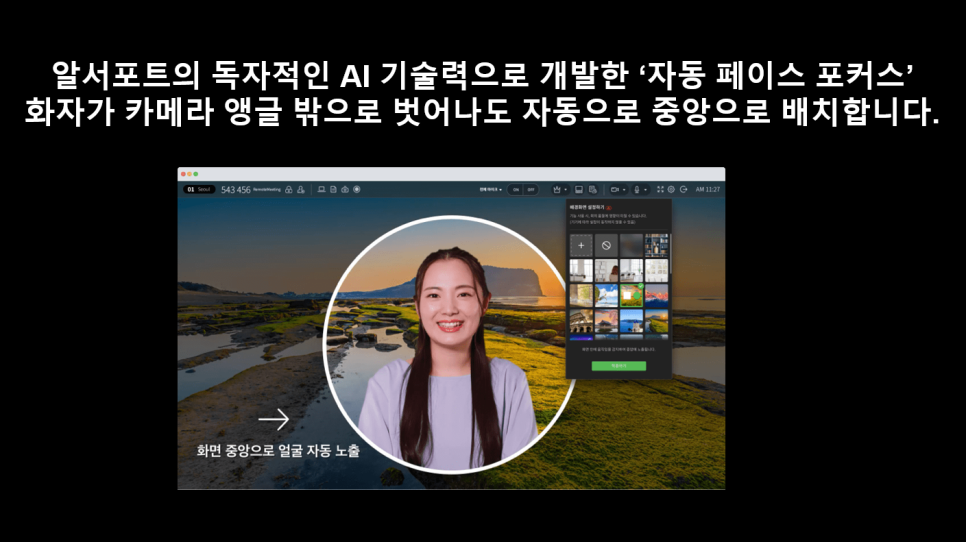 현재 특허 출현 중인 알서포트의 독자 기술, '페이스 포커싱' 기술을 소개할게요. 화상회의를 진행하다 보면 말하는 도중에 무의식적으로 몸을 좌/우로 움직인다거나 뭔가를 찾으려고 사람이 카메라 앵글에 반쯤 걸쳐 있거나 아예 밖으로 나가는 걸 많이 보셨을 거예요. 말하는 사람이 카메라 정중앙에 있지 않고 카메라 앵글 밖으로 자꾸 이탈하면 그것만큼 산만해 보이는 회의는 또 없습니다. 리모트미팅은 가상 배경을 설정하게 되면 사람이 카메라 밖으로 나가더라도 자동으로 카메라 정중앙으로 배치시키는 '페이스 포커싱' 기술을 현재 제공 중에 있습니다.