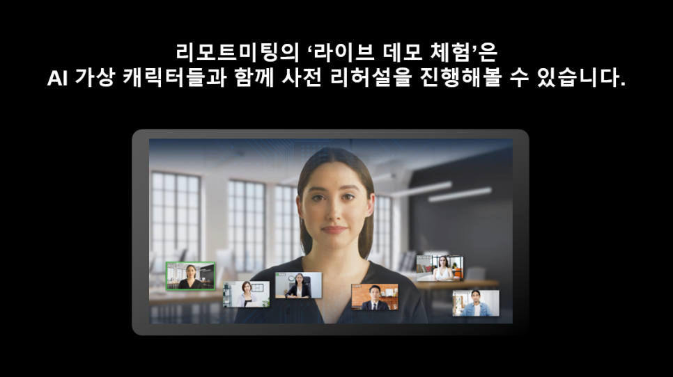 마지막으로 소개드릴 기능은 바로 'AI 라이브 데모'입니다. 처음으로 주최자가 되어 화상회의를 진행해 보려고 하시는 분들이라면, 회의 전에 보통 방 개설을 한번 하고 '회의 초대는 어떻게 하는지?' '어떤 기능들이 탑재되어 있는지?' '문서 공유 또는 화면 공유를 하면 상대방에게 어떤 화면으로 보여지는지?' 실전에 앞서 미리 제품 기능들을 숙지하고 리허설을 진행해 보시는데요. 리모트미팅은 24시간 준비되어 있는 '가상 회의실'에서 로그인 없이 누구나 바로 AI 가상 캐릭터들을 대상으로 호스트(즉, 회의 주최자)가 되어 사전 리허설을 진행해 보실 수 있습니다.
